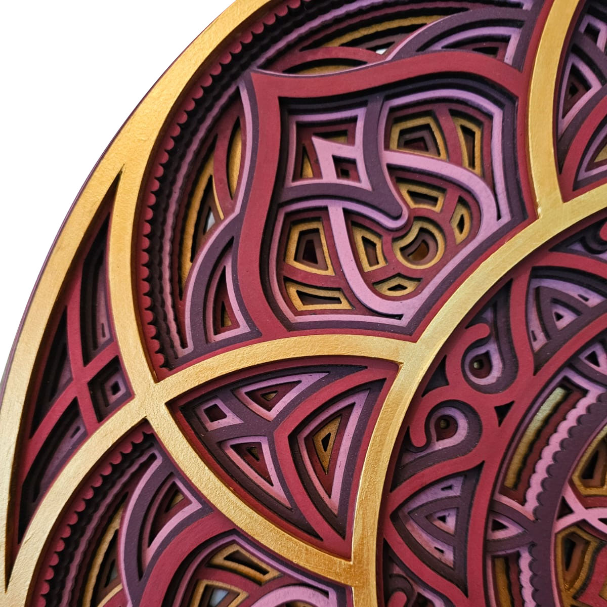 Esta peça possui 40 cm de diâmetro, detalhes dourados que trazem a peça muita luz e belos tons vermelhos e púrpura conferindo a peça uma exuberante energia feminina e espiritual.